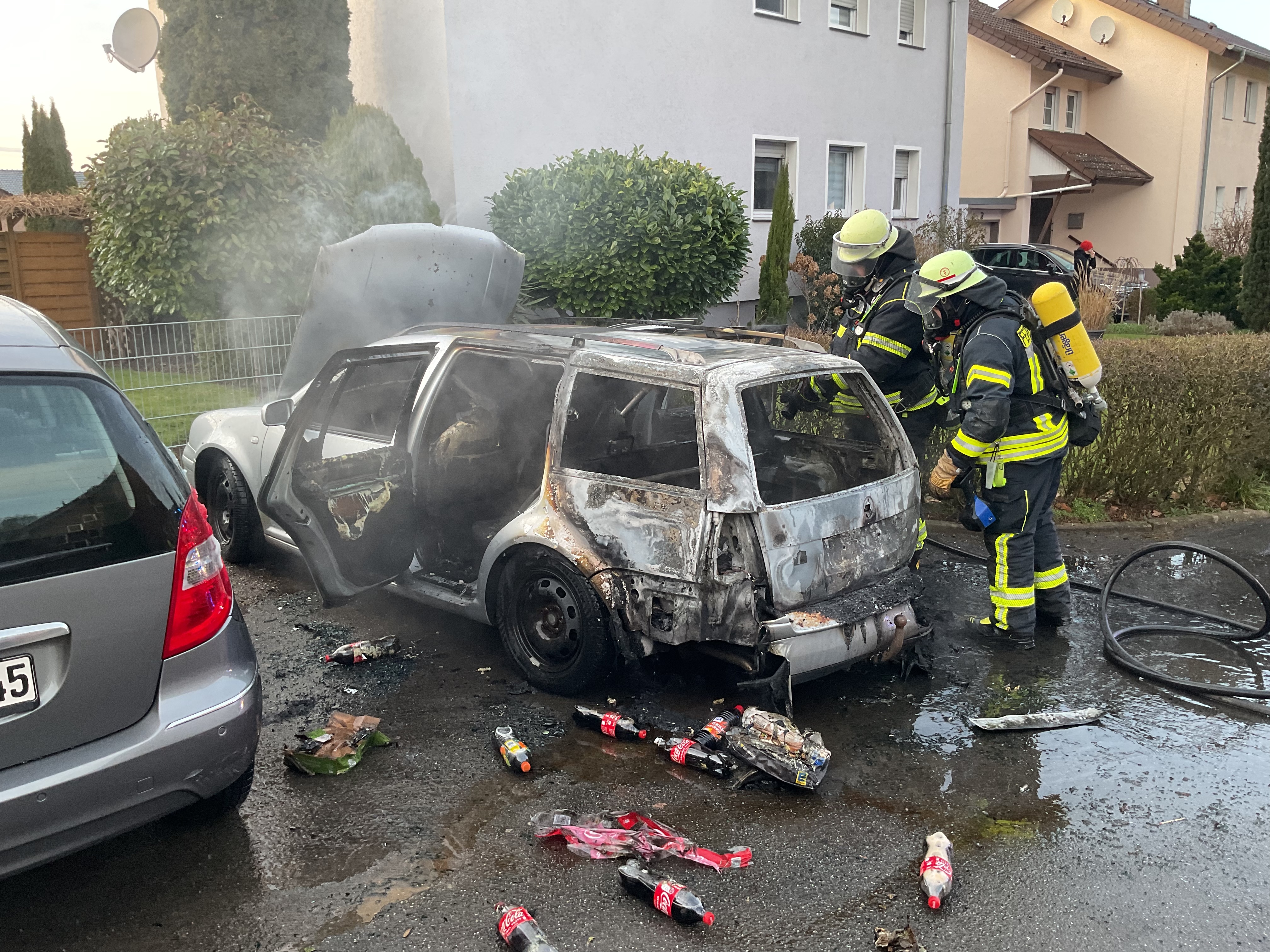 Beim Eintreffen stand der PKW bereits in Vollbrand. Ein daneben geparktes Fahrzeug war ebenfalls schon in Mitleidenschaft gezogen worden. Ein Trupp unter Atemschutz löschte den Brand mit dem Schnellangriff ab. Nach den Löscharbeiten wurden die PKWs mit der Wärmebildkamera kontrolliert und abschließend die Einsatzstelle an die Polizei übergeben.