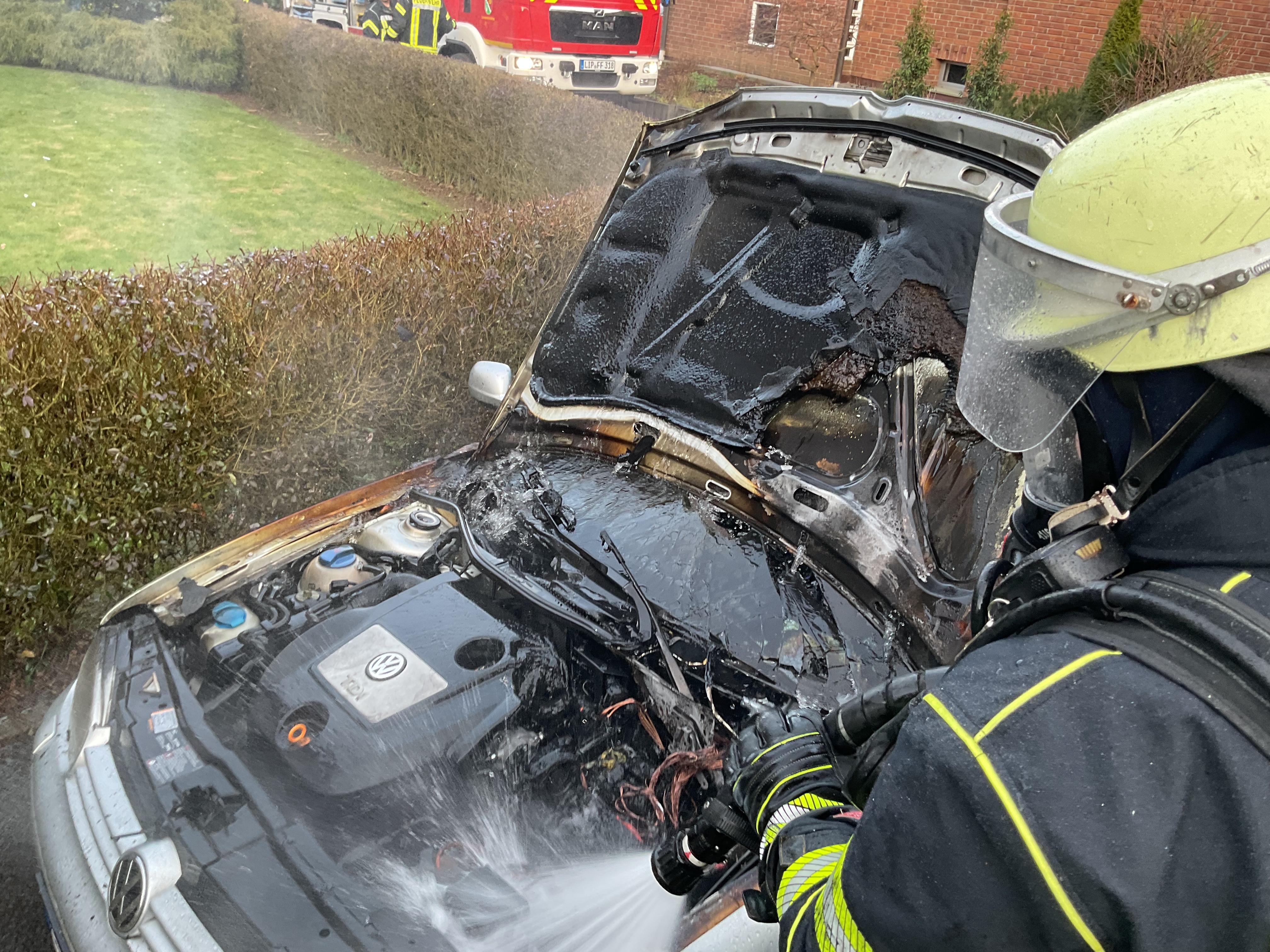Am Samstagnachmittag wurden die ehrenamtlichen Kräfte in die Cornelis-Blaauw-Straße (Bechterdissen) zu einem brennenden PKW alarmiert.