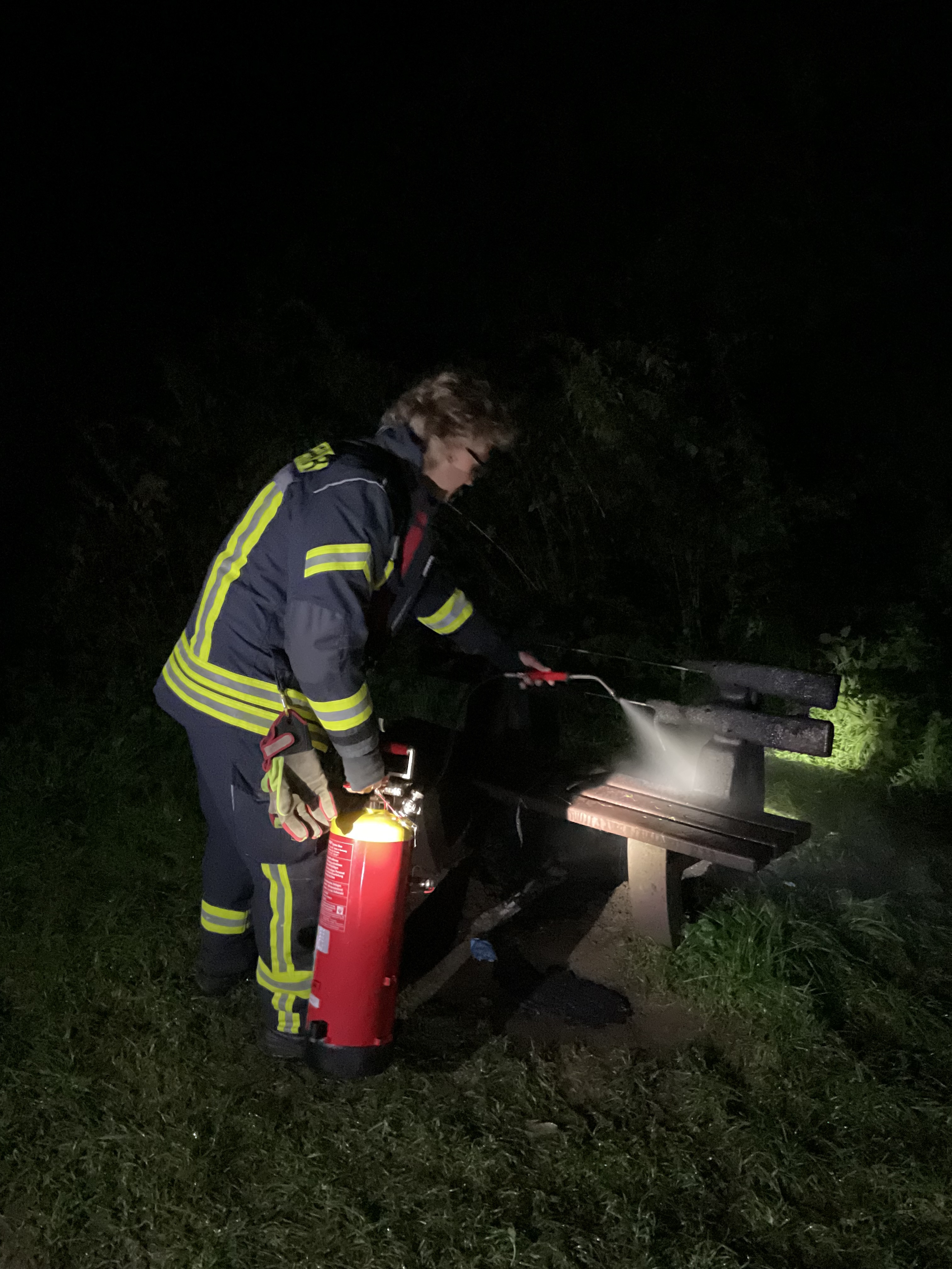Zwischen Heimathof und den Regenwasserrückhaltebecken brannte eine Parkbank. Diese wurde mittels Kleinlöschgerät abgelöscht und mit der Wärmebildkamera kontrolliert.