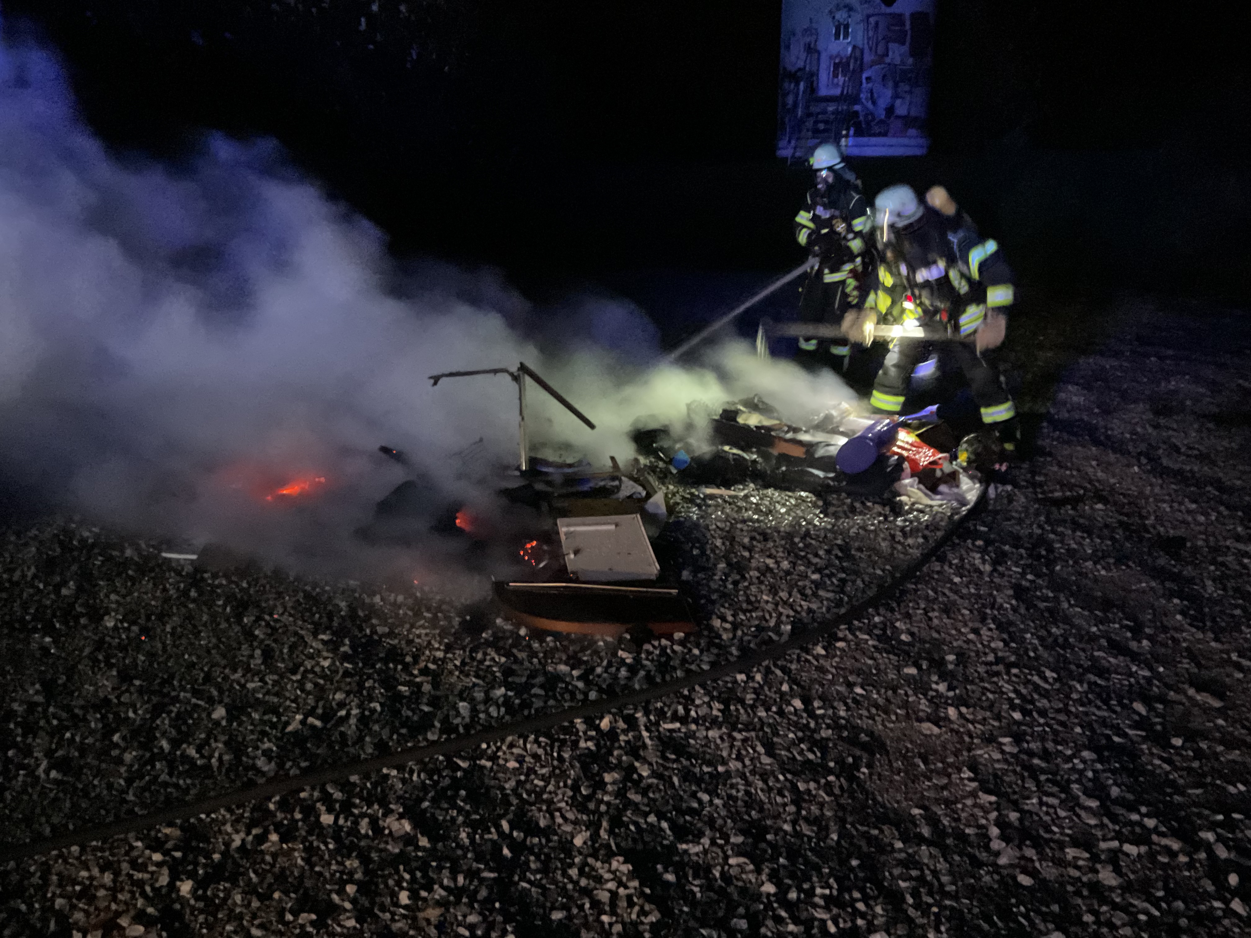 Mittels C-Rohr wurde der Haufen abgelöscht und auseinander gezogen. Abschließend wurde der Haufen mittels Wärmebildkamera kontrolliert und an die Polizei übergeben.